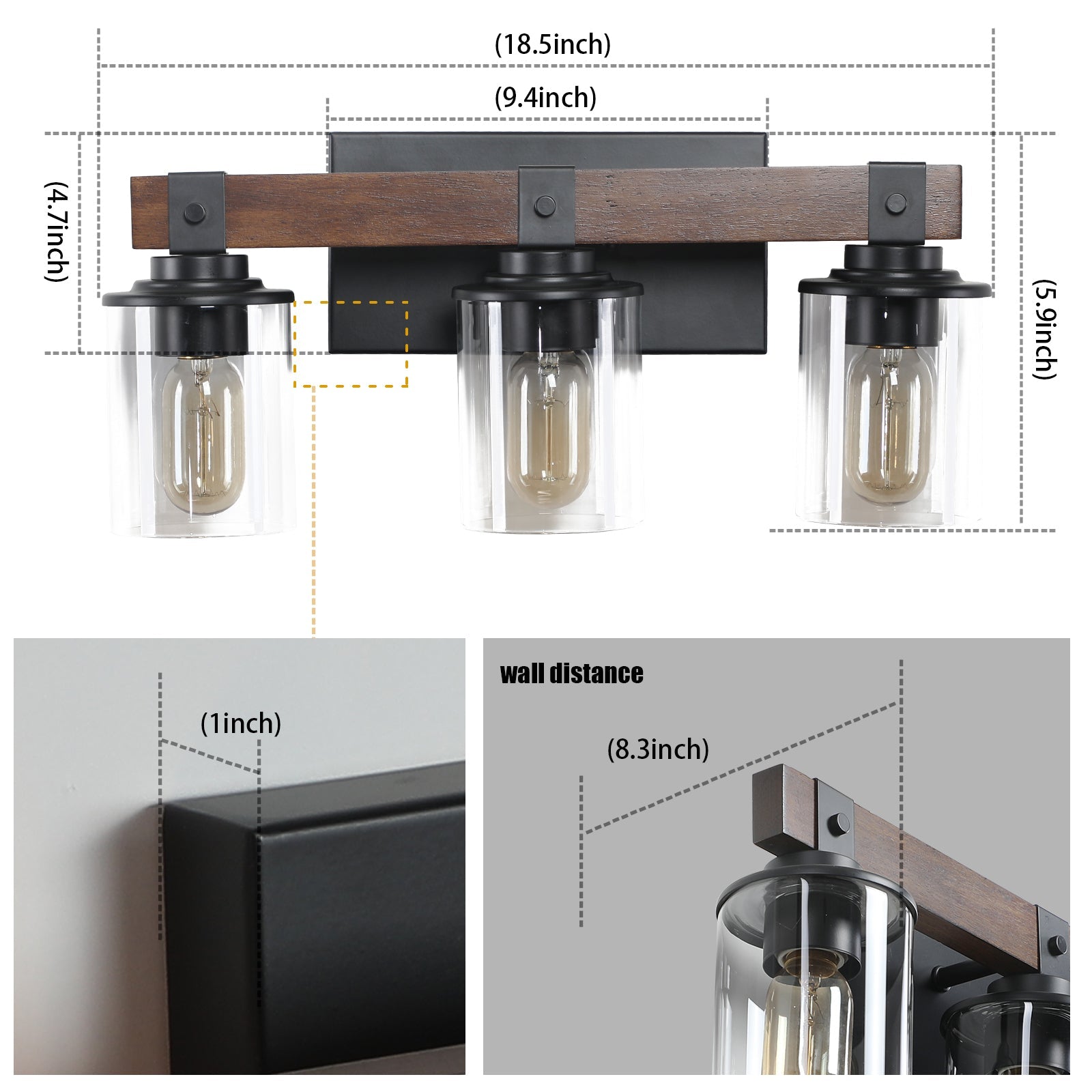 Experience the difference of handcrafted quality with this exquisite 3-light vanity light fixture. Each piece is meticulously crafted using a combination of rich walnut wood and durable black iron, ensuring both beauty and lasting performance. The detailed wood grain adds a touch of rustic charm, while the tempered glass shade provides a soft, even light distribution. More than just a light source, this fixture is a statement piece, reflecting your appreciation for timeless design and superior craftsmanship. It's built to withstand the humidity of a bathroom environment, ensuring years of reliable use. Easy installation with all hardware included. Compatible with E26 bulbs (max 60W per bulb). Dimensions: 18.5"L x 8.3"W x 5.9"H.